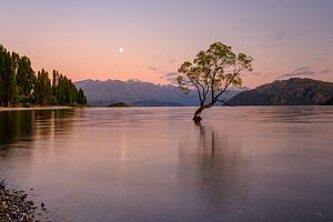"That Wanaka Tree", also known as the Lone Tree of Wanaka, is a 70-plus years old willow tree that can be found at the shore of Lake Wanaka in South Island, New Zealand. This picture was taken at the crack of dawn, just as the moon was setting into the mountains.